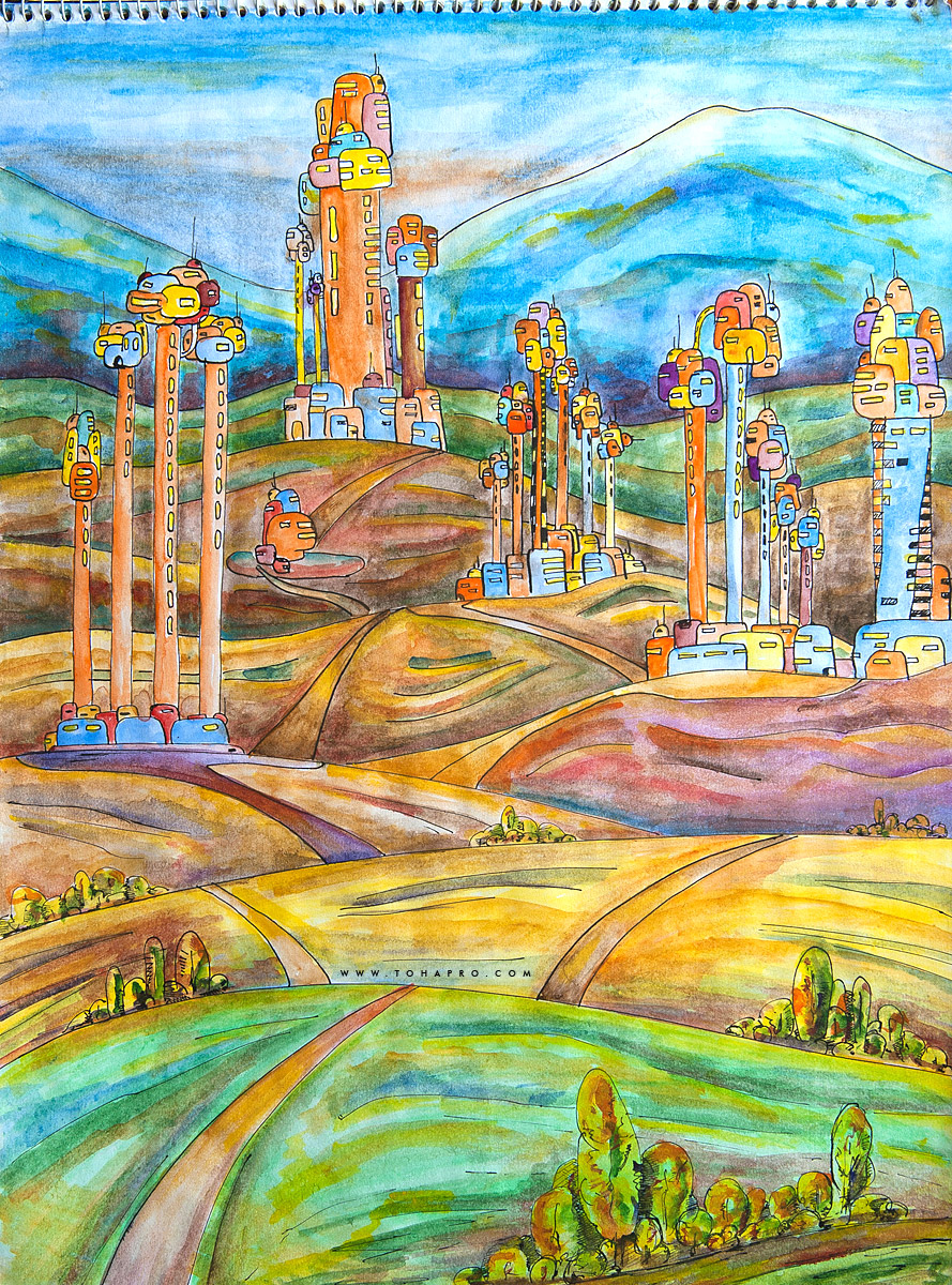 Цветочный город № 1 серия рисунков, которую я назвал «цветочный город», все сделаны в полях и на холмах, куда я добирался на велике. Так что это в какой-то степени натура, но превращенная в абстракцию. альбом, тушь, акварель
