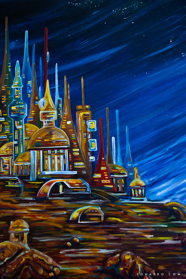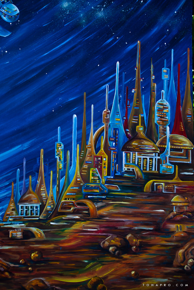 «Два города в космосе» я рисовал в июле месяце, стоя под большущим абрикосом, смотрю на него сейчас из окна, а он до сих пор еще зеленый, хотя и на нем уже начали появляться желтые листья.